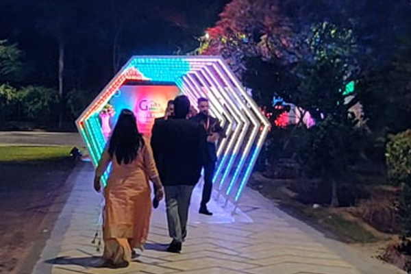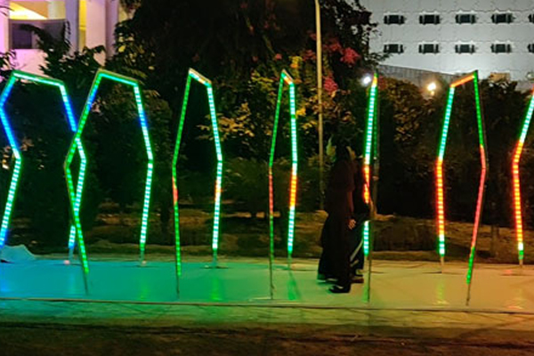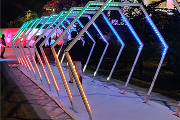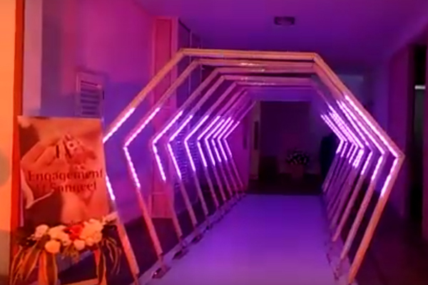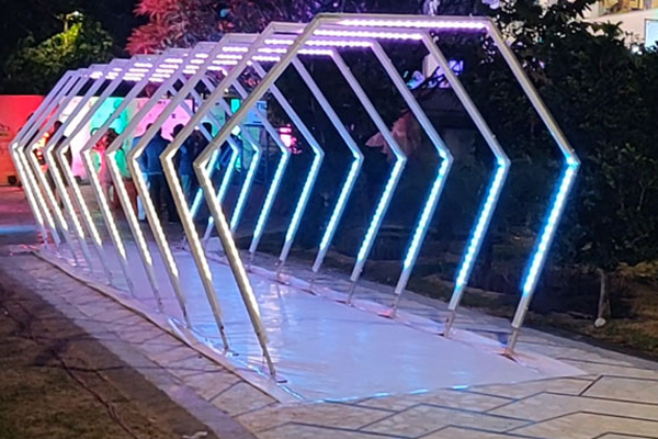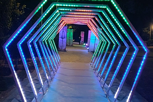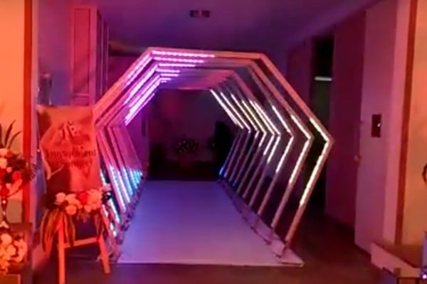 Hexa Pixel Tunnel is a modular art installation featuring 1000+ LEDs forming a mapping tunnel where people can pass through. Music and LEDs can be synchronized creating an immersive mapping experience for the audience