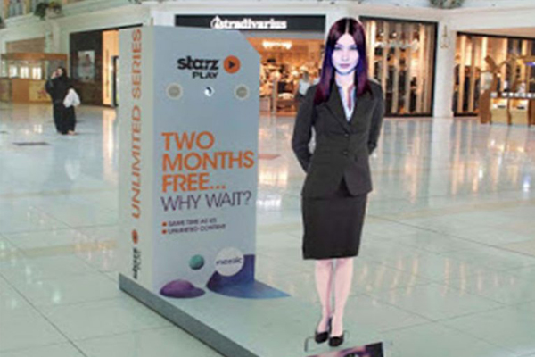 Magik Touch offeris the ability to create your own virtual Presenter. A video of a salesperson is recorded and an acrylic cut-out is created using the outline of their form. A piece of Holographic Projection Film is applied to the upper body, while a printed vinyl graphic is used for the lower body.